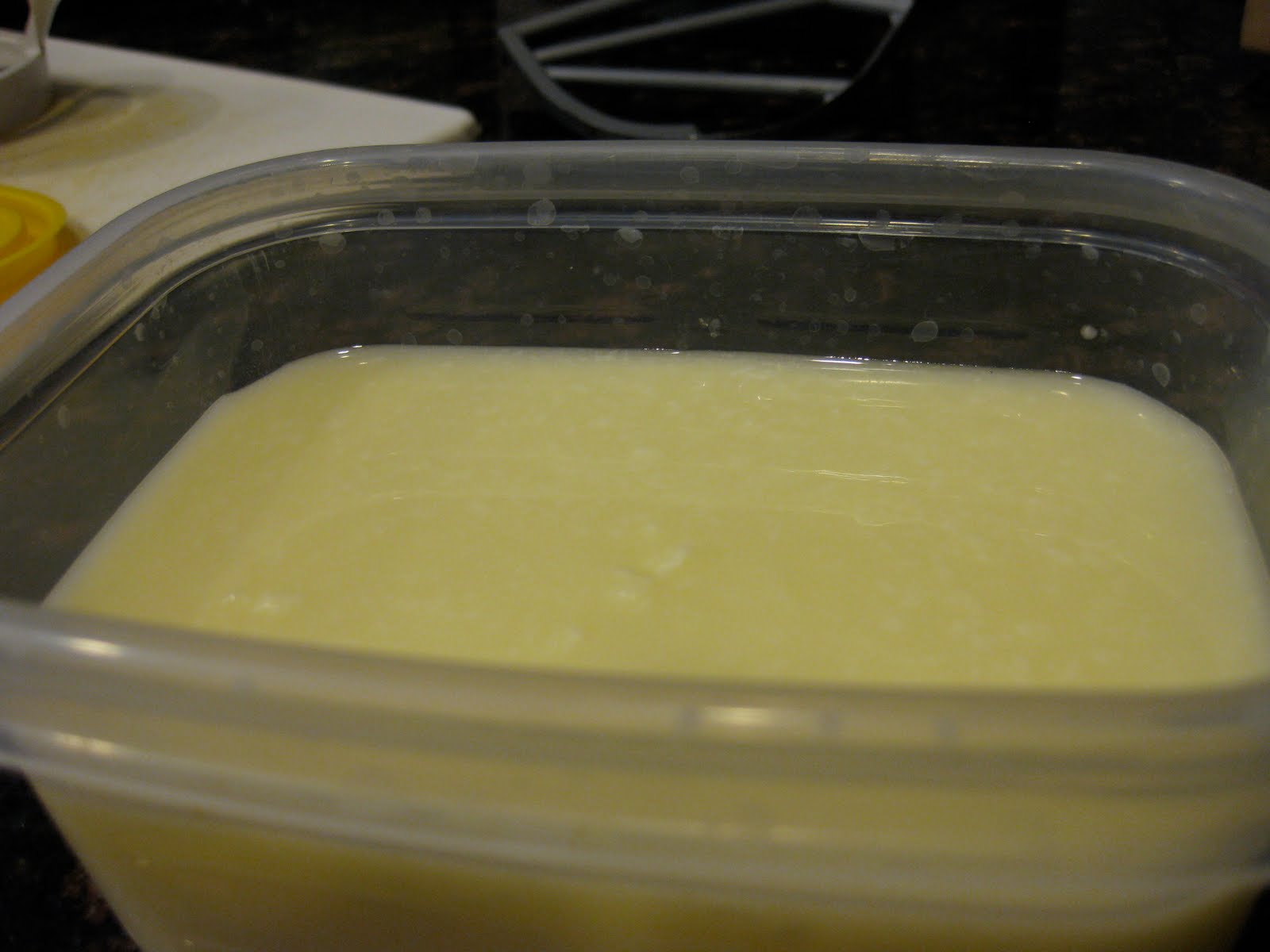 What you do is mix equal parts just-softened butter with canola oil. To fill a little tub like this, I use a cup of butter and a cup of oil. It's pretty liquidy when you mix it, but it sets up in the fridge. Soft even when cold. She uses unsalted butter and adds in her own salt. I just use salted butter and save myself the trouble.